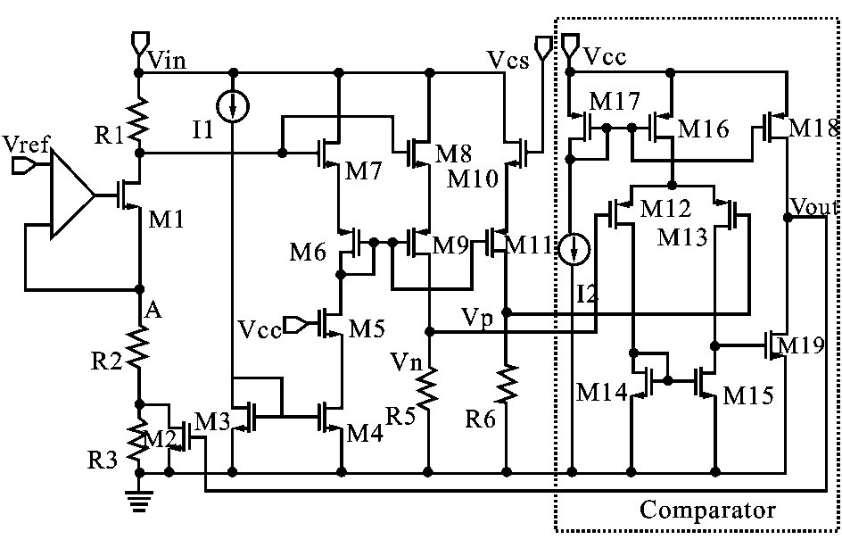 4. 5V~28V 的输入电压经调整转换为5V 的恒定电压Vcc 为后续电路供电。 如图3 所示,A 点电位受运算放大器钳制,将等于参考电压1. 2V ,假设输出V out 为高电平,则M2 导通,流过M1 的电流为IM1 = V ref / R2 ,B 点的电压为V BL = V in - IM1 R1 ;当V out为低电平,M2 截止,流过M1 的电流变为I′M1= V ref / ( R2 + R3 ) ,B 点电压升高为V BH = V in -I′M1 R1 ,所以B 点电压的变化为ΔV B = V BH - V BL= V ref R1 R3/ R2 ( R2 + R3) ,这意味着V out由高电平变成低电平时在B 点产生的一个滞环电压,可见该滞环电压与输入电压无关,只由参考电压V ref和电阻大小决定,通过选择各电阻的阻值便可设定滞环电压的大小。