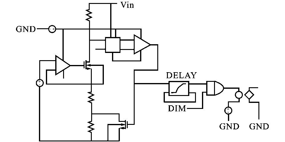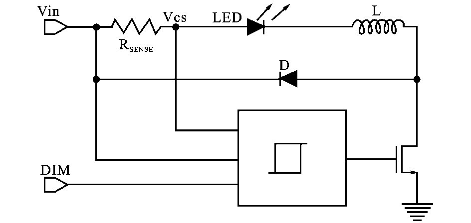 滞流控制模块内部电路如图2 所示,当DIM 信号为高电平期间,当Vcs 大于上电压阈值时,控制电路输出低电平,关闭功率开关管。 由LED、电感L 、续流二极管D 和RSENSE组成的回路使得电感继续为L ED 提供电流,电感电流逐渐减小,使得检测电压Vcs 随之减?。坏盫cs 小于下阈值电压时,控制电路输出高电平,导通功率开关管,此时D 截止,形成从电源经RSENSE、L ED、L 和功率开关管到地的回路,电源为电感L 充电,电感电流上升,检测电压Vcs随之升高。 Vcs 大于上电压阈值时,控制电路关断开关管,重复上个周期的动作,这样就完成了对L ED驱动电流的滞环电流控制,使得流过L ED 的驱动电流,也就是电感电流的平均值恒定。