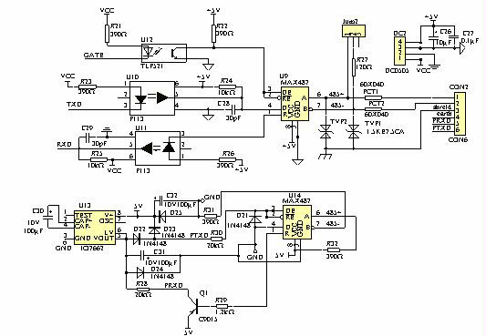 本文设计的接口电路主要是针对工业现场控制终端,由于各种控制要求不同,所以对控制终端的配置各异。但总体要求是某一终端故障不应影响系统其余部分的功能,要便于终端与监控系统之间的接口。所以,本文设计中对于RS-485与RS-232的转换采用了无源的转换方式,而非常规的RS-232与RS-485标准转换,既便是与PC相连的终端单元掉电,也不会影响系统中其它单元的正常通信。