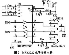 系统产生的信号需要经过电平变换,转换成RS-232电平,与计算机通信。这里采用MAX3232为核心电平变换电路。其原理图如图2所示。