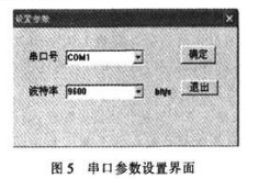 要实现计算机串行通信的功能,一种较为简便的方法是使用MSComm(Microsoft Communication Control)通信控件,它提供了标准的事件处理函数过程,是微软公司开发的专门用于串行通信的控件。它是高级语言编写的串行通信程序和PC串口之间的桥粱。本系统采用得就是这种方法。设置控件的属性。添加控件的响应代码。就可以使串口按照要求进行工作。在这个界面,可以进行串口号和波特率的设置。通信参效设置界面如图5所示。