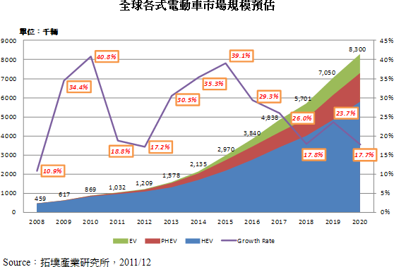 2020年前全球新能源车市场成长动能主要以油电混合车(Hybrid Electric Vehicle;HEV)为主,预计目前仍为全球电动车销售上升主力,约占整体电动车市场70%。2011年后随着锂电池技术渐趋成熟,插电式油电混合车(Plug-in Hybrid Electric Vehicle;PHEV)市场逐渐起飞,2012年起将呈显著成长,2020年销售量将达150万辆,占整体电动车市场的18%,而完全仰赖电池做为动力来源的纯电动车(Battery only Electric Vehicle;BEV),由于各国政策推动期程不一,现仍处于示范运行阶段,预计2020年占整体电动车市场的12%。