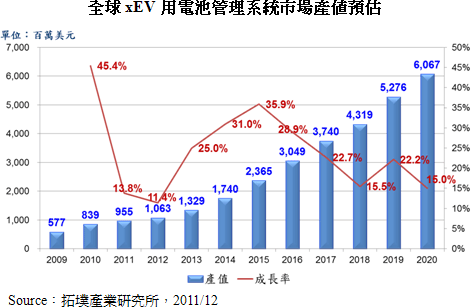 因此,透过BMS能准确量测电池组使用状况,?;さ绯夭恢劣诠瘸浞诺纾胶獾绯刈橹忻恳豢诺绯氐牡缌?,以及分析计算电池组的电量并转换为驾驶可理解的续航力信息,确保动力电池可安全运作。拓墣预测2012年全球BMS市场产值成长逾10%,2013年至2015年成长幅度将大幅跃升至25%~35%。