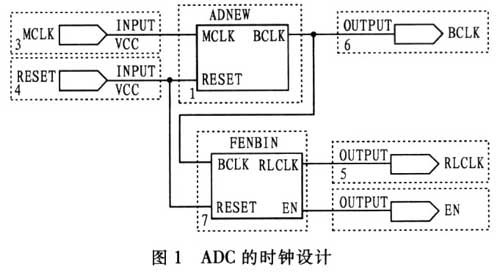图1示出A/D转换器的输入时钟设计,MD转换器工作在从模式下时,需要外部提供RLCLK和BCLK。在主时钟MCLK的输入下,通过对MCLK 4分频得到BCLK的信号,用来作为位数据提取的信号。RLCLK是通过对BCLK的32分频得到的,用来区分左右通道的数据,同时输出EN信号作为后续处理的同步信号。