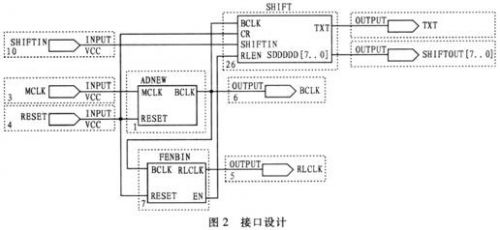 在图2中,输入为MCLK(主时钟)、RESET(启动信号)和SHIFTIN(A/D输出数据),输出为RL(左右帧信号)、BCLK(A/D数据位时钟),TXT(并行数据读取控制)和SHIFTOUT(并行数据输出)。通过时钟控制输出BCLK和 RLCLK到AD1871,AD1871传出数据SHIFTIN进入SHIFT??椋琒HIFT??樵谡返奈皇敝酉露寥HIFTIN的输入数据,并进行串,并转换,之后输出8位或12位的数据。同时输出TXT并行数据读取控制。