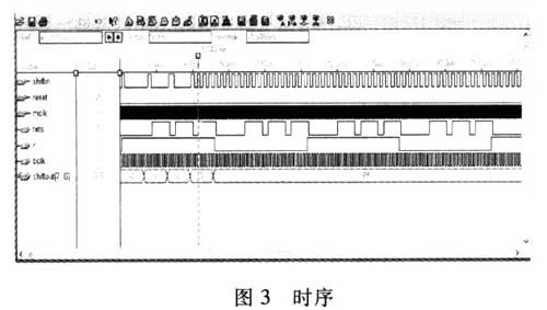 笔者用MaxPlus II对以上设计进行仿真后得到图3所示的时序图,完全满足设计要求,从图3可以看出串行输入的数据(shiflin)变成并行的数据(shiftout) 输出,在此过程中数据延时8个周期,每个txts的上升沿提取数据能保证数据的正确性。因为从数据的变动到txts的上升沿有400ns,大于FPGA的数据建立时间(25ns~50ns),可以保证提取数据的正确性。