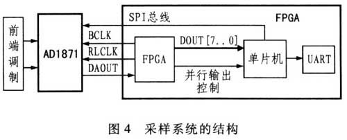 图4示出采用ADl871构成的采样系统结构。整个系统在1个FPGA上实现,分为3部分:并转换模块;ADC控制和配置;UART通信。