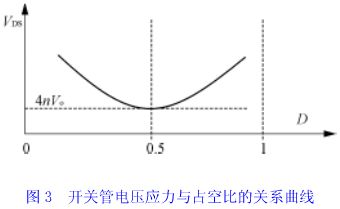 上式说明,当变压器匝比愈小时,对于一定的输入电压和输出电压的变换器,开关管电压应力vds愈小。所以,有源钳位正激变换器一个显著优点是可以降低开关管电压应力,从而可选用额定电压较低、通态电阻较小的功率开关管。另外,当变压器变比n确定后,开关管电压应力仅与占空比有关,如图3所示。显然,当占空比为0.5时,开关管承受最小的电压应力。当输入电压变化时,如果将占空比设计运行在以0.5为中心的对称范围内,则可使开关管承受的电压应力基本保持恒定。