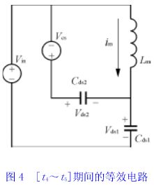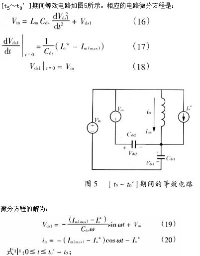 当辅助开关sa断开后,由于磁饱和电感ls瞬间相当于开路,因此变压器励磁电流可完全用来对cds2和cds1充放电。[t4~t5]、[t5~t0′]期间,等效电路同图4。显然,令式(21)和(24)中io*或io为零,即可得到主开关管零电压导通的能量条件和时间条件,im(max)≥cdsωvin,即: