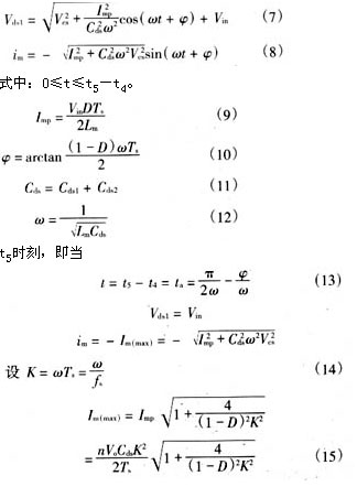 从上面的分析可明显地看出,当变压器励磁电感lm减小,励磁电流足够大时,[t5~t0′]期间励磁电流除了能提供负载电流外,剩余部分可用来帮助电容cds2、cds1充放电。电压vds1有可能谐振到零,从而实现主功率开关管s的零电压软开通。二极管d1可为负的励磁电流续流。关键工作波形如图2(b)所示,具体的软开关条件将在下一节中详细讨论。很显然,软开关的代价是变压器励磁电流和开关管导通电流峰值大幅增加,开关管及变压器电流应力和通态损耗明显加大。