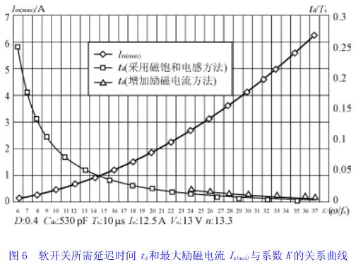 6)设定死区时间td为350ns,采用磁饱和电感方法实现软开关。则据式(26)求出k为15.4。