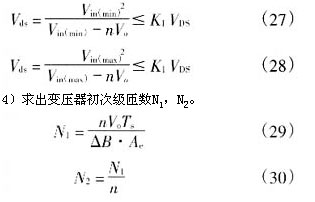 4)据式(29)、(30)求出变压器初次级匝数n1,n2分别为40匝和3匝。