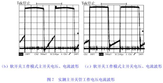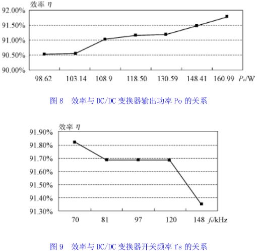 图7(a)、7(b)、7(c)给出了实测的主开关管工作电压、电流波形。图7(a)显示主开关管工作在硬开关状态。图7(b)和图7(c)分别是采用增加励磁电流方法和应用磁饱和电感器方法实现零电压软开关的电压电流波形,后者明显地降低了励磁电流和开关管电流的峰值。实测波形与理论分析完全一致。图8、9显示出了实测的效率曲线。从图9中看出,当变换器开关频率增加时,变压器励磁电流损耗和开关管通态损耗所占比重增加,变换器效率降低了。实验结果验证了理论分析。