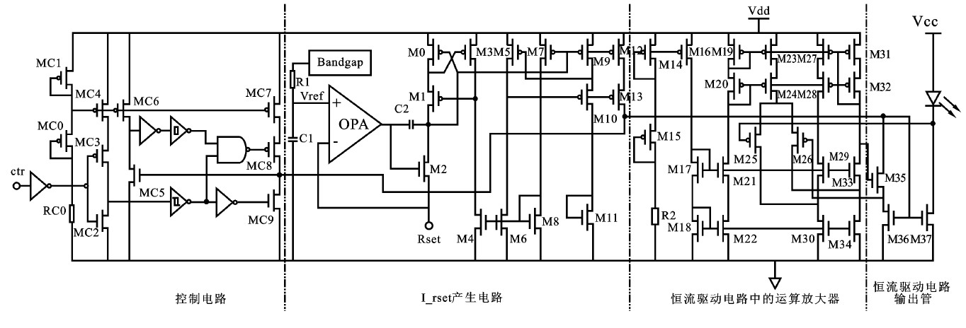 恒流驱动模块是整个控制电路设计核心,决定整体电路的恒流特性。针对此??楦鋈址桨?。具体电路结构如图1所示。图中电流I_rset只受控于外接电阻Rset,当Rset不变时,此电流恒定。Vcc是电路的外接电压,用来为LED供电。