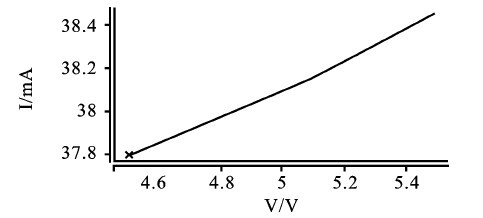 设置Rset为500Ω、Vcc为3V,令5V电源电压产生±10%的波动,此时恒流输出情况如图5.驱动电流由37.8mA变化到38.5mA,波动百分比为1. 85%。
