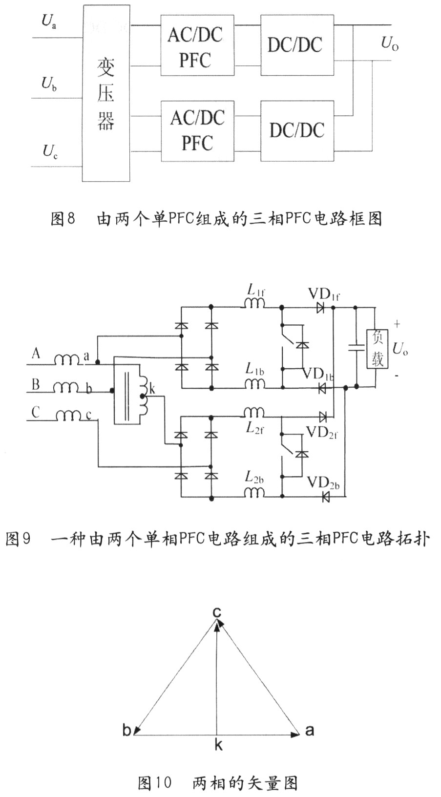 图8是由两个单相PFC组成的三相PFC电路框图,图9是其一种实际的应用电路图,工作原理是,三相输入电压Ua,Ub,Uc(相位相差120°)。通过带有中心抽头的变压器变成两相电压Uab和Uck(相位相差90°),Uab和Uck。的矢量图如图10所示。