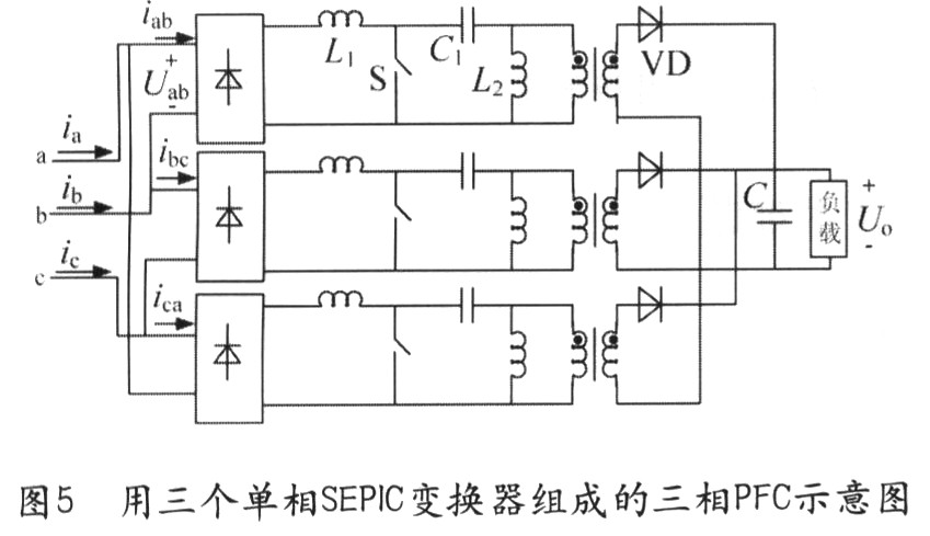 在Boost变换中,传统的隔离在此种情况下的应用并不理想,因为在电流连续情况下,器件将产生高的电压应力,在电流断续情况下将产生较大的输入电流失真。图5所示的电路是用隔离SEPIC电路组成的三相PFC电路,SEPIC变换器的输入端类似于Boost电路,因此具有Boost电路的优点,如有低的输入电流失真和更小的EMI滤波器。在输出端SEPIC电路像反激式变换器,从而不必以增加电压为代价达到隔离的作用。