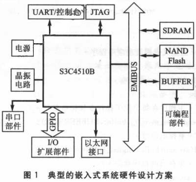 图1是一种典型的嵌入式系统硬件设计方案。系统的微处理器采用S3c4510B,是基于ARM7体系结构的。SDRAM是一种易失性存储器作为程序的运行空间,类似于PC机的内存;Flash作为程序存储空间是非易失性的。程序运行过程中的数据往往缓存在sDRAM中,在系统失电时必须写往Flash。
