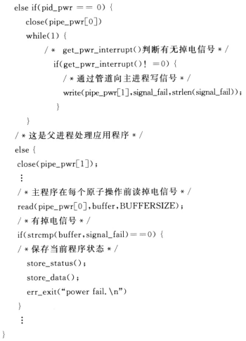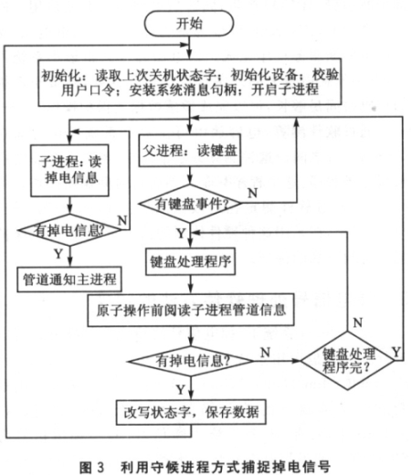 另一种方式是采用守候进程的方式,开通一个进程,此进程专门等待中断信号。主程序根据数据操作对象的不同,将自己的流程方案划分成若干原子操作,所谓原子操作即划定的程序块要么完全执行,要么不执行。每个操作对应惟一状态标志。在每个原子操作前,主进程都将会通过管道通信的方式阅读中断信号。如果中断信号产生,主进程首先保存状态标志,然后将相关数据写往Flash后退出,电源恢复后,主进程首先根据标志字确定系统恢复方案。图3用流程图的方式实现这一过程。