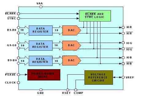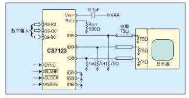 CS7123还有SYNC同步信号和BLANK黑电平控制信号这两个附加的视频控制信号,CS7123也具有一个待电模式。CS7123采用5V CMOS工艺制造,单片CMOS结构确保了低功耗性能。CS7123的主要功能是将三路RGB信号转换为模拟RGB信号后输出到显示屏显示。另外,它也可以当作三路单独的DAC使用。