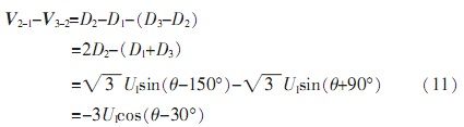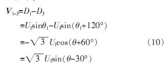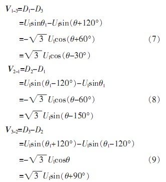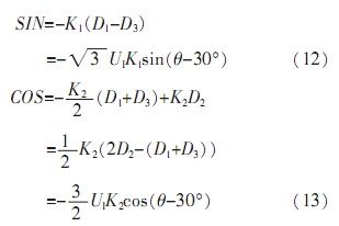 由于自整角机中定子绕组为星型连接,彼此在空间上呈120°,并且输出三路定子绕组电压D1、D2、D3是相对于中心点而言,无法对其单独处理。由公式(5)可知,其任意两线间电压为: