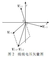 三路线线电压在空间上的矢量图如图2所示。由图2可知,三路线线电压中任意两路之差与第三路呈正交关系,若能提取出这样的两路正交信号,就能很好地解决芯片的输入问题。对此作出如下推导: