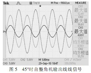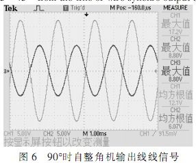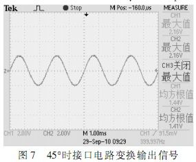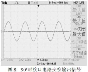 根据图中所示,在确定的角度下,自整角机三路线线信号在电压上呈120°正弦关系,接口电路转换输出信号为两路电压正交信号,根据角度不同,两路信号电压峰值不同,单路最大时电压为2Vrms。测试结果完全符合设计要求。