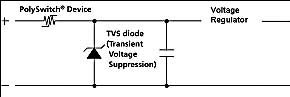 采用PolySwitch器件来取代上述应用中的正向导通二极管(见图2),提供了包括减少电压降等多项优势,这是因为聚合物正温度系数(PPTC)器件两端的电压降一般在0.1V以上。其次,聚合物正温度系数(PPTC)器件可对其他类型的电子部件提供额外的?;ぃò槿?、导线、继电器和固态部件等)。