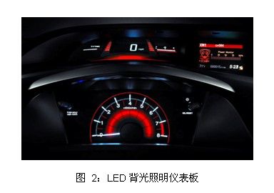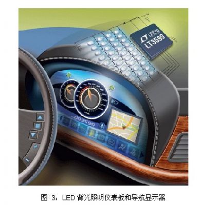 诸如尺寸小、寿命极长、功耗低和调光能力增强等优势已经导致 LED TFT-LCD 背光照明在今天的汽车、卡车、火车、飞机和轮船中得到了广泛采用。LED 背光照明主要是从信息娱乐系统开始的,这类系统一般有一个 LCD 显示屏,安装在仪表板中央某个部位,以便驾驶员和乘客都能非常容易地看到它们的位置、执行音频调谐和其他各种任务。很多新出现的汽车设计都利用单个仪表板,以对方便驾驶员实施控制的所有显示仪表进行背光照明,如图 2 所示。对仪表板的 LED 背光照明常常是与信息娱乐系统共用的,从而非常容易读取控制板上的数字。类似地,包括轿车和火车在内的很多车辆以及还有安装在飞机座椅背后的 LCD 显示器,可供乘客看电影、玩视频游戏等等。历史上,这类显示器一直使用 CCFL 背光照明,不过用非常扁平的白光 LED 阵列替换相对较大的 CCFL 灯,以提供更准确和可调节的背光照明以及能超过车辆或飞机寿命的工作寿命,这已经变得越来越常见了。