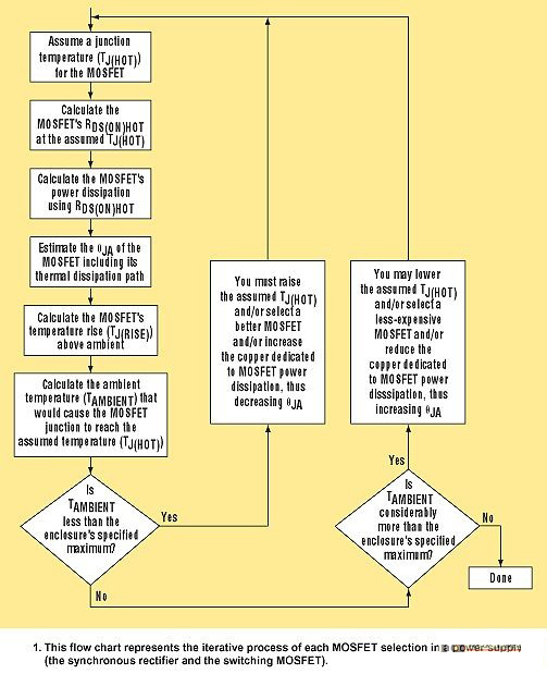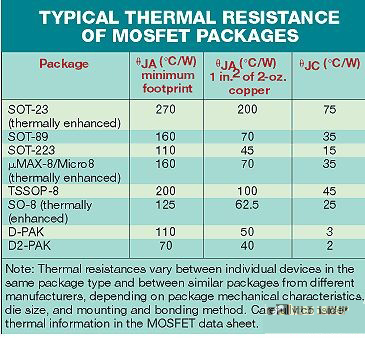 再参考图1说明,确定是否正确选择了用于同步整流器和开关MOSFET的MOSFET迭代过程的下一个步骤。这一步骤计算每个MOSFET的环境空气温度,它可能导致达到假设的MOSFET结温。为此,首先要确定每个MOSFET的结与环境间的热阻(ΘJA)。