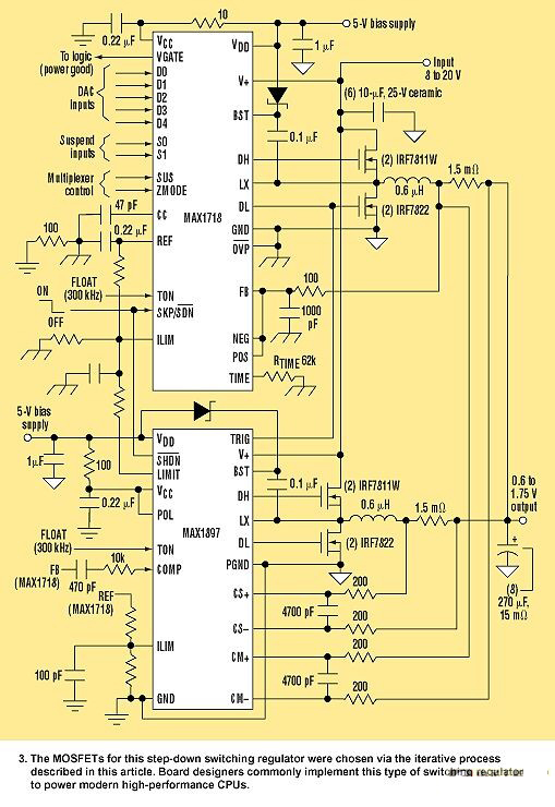 在室温下组合的最大RDS(ON)为6mΩ,在115°C(假设的TJ(HOT))为8.7mΩ的两个并联IRF7811WMOSFET组成开关MOSFET。组合CRSS为240pF。MAX1718以及MAX1897的1Ω栅极驱动输出约为2A.。当VIN=8V时,电阻损耗为0.57W,而开关损耗约为0.05W。在20V时,电阻损耗为0.23W,而开关损耗约为0.29W。在每个操作点的总损耗大体平衡,而在最小VIN处的最坏情况下,等于0.61W。