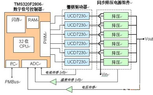 本文描述了一款数控多相交错式DC/DC降压系统,其可实现电压模式调节控制,并具有切相及增相和多相电流平衡的特点。使用传统模拟控制器来实施这些特性将会十分具有挑战性,而使用一款基于微处理器的数字控制器便可以轻松地完成这些任务。F2806数字信号控制器与UCD7230栅极驱动及电流传感放大器的完美结合提供了一款完整的信号控制解决方案,并具有单机运行的片上闪存、同步高精度PWM???、测量反馈信号的ADC以及PMBus通信功能。