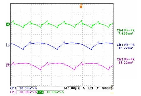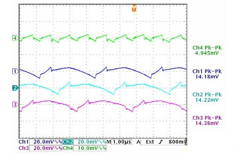 图2a显示了一款120°交错式(条件:10V输入、2V输出、3A负载及300kHzPWM开关)PWM结构的三相交错式降压转换器的示波器屏幕采集图。示波器通道1至3显示的是单个相位电压,而通道4显示的是交错式输出电压(所有示波器通道均为AC耦合)。通过所有运行中的三个相位,可以得出该输出纹波为4.9mV(输出电压的0.25%)。在没有调整两个剩余相位(见图2b)角的情况下,切除相位2会引起输出纹波增加86%,即为9.1mV。为了获得180°交错(见图2c),对两个剩余相位进行软件调整以后,该纹波减少至7.9mV。在仍然比初始值大的同时(因为一个两相位系统无法获得如一个三相系统一样的低纹波),其比未被调整的剩余相位角提高了13%。