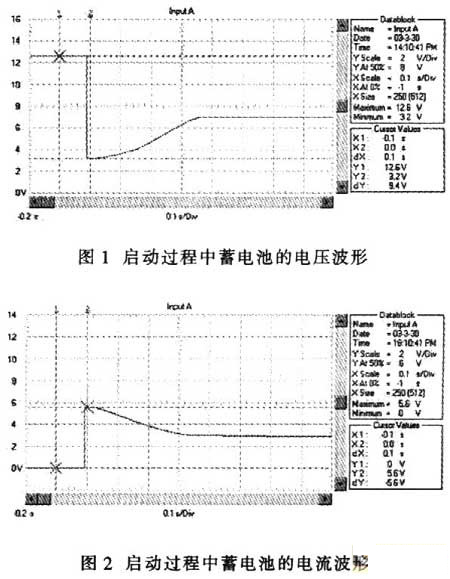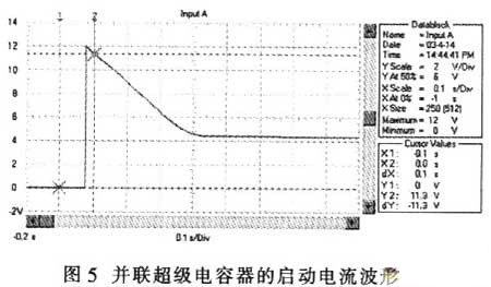 超级电容器与蓄电池并联时,汽车启动过程的电压波形如图4所示,电流波形如图5所示。与图1和图2相比,启动瞬间电压跌落由只采用蓄电池时的3.2V提升到7.2V;启动电流从560A提高到l200A;启动瞬时的电源输出功率从2kW上升到8.7kW;启动过程的平稳电压由7V提高到9.4V;启动过程的平稳电流由280A提高到440A;启动过程的电源平稳输出功率从2.44kW提高到4.12kW。
