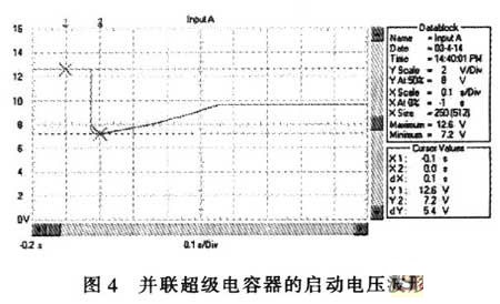 蓄电池是汽车中的关键电器部件,其性能直接影响汽车的启动。现在的汽车启动无一例外地采用启动电动机启动方式。在启动过程中特别是在启动瞬间,由于启动电动机转速为零,不产生感生电势,故启动电流:I=E/(RM+RS+RL);其中:E为蓄电池空载端电压,RM为启动电动机的电枢电阻,RS为蓄电池内阻、RL为线路电阻。由于RM、RB、RL均非常低,启动电流非常大。例如用12V、45Ah的蓄电池启动安装1.9L柴油机的汽车,蓄电池的电压在启动瞬间由12.6V降到约3.6V,启动过程的蓄电池电压波形如图1所示。启动瞬时的电流达550A,约为蓄电池的12C的放电率>启动过程的蓄电池电流波形如图2所示。电流传感器的电流/电压变换比率为100A/V。尽管车用蓄电池是启动专用蓄电池,可以高倍率放电,但从图l可以看出,10倍以上高倍率放电时的蓄电池性能变得很差,而且,如此高倍率放电对蓄电池的损伤也是非常明显的。启动过程的电压剧烈变化也是极强的电磁干扰,可以造成电气设备掉电,迫使电气设备在发电机启动过程结束后重新上电,计算机在这个过程中非常容易死机。因此,从改善汽车电气设备的电磁环境、改善汽车的启动性能和蓄电池性能或延长蓄电池使用寿命来考虑,改善汽车电源在启动过程中的性能是必要的。解决问题的方案之一是加大蓄电池的容量,但需要增加很多,并使其体积增大,这并不是好的选择。而将超级电容器与蓄电池并联可以很好地解决这个问题。