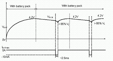 使用者亦有可能在充电或式充电完毕后,在未将电源移除的情况下,即抽离电池的情况。为避免造成危险,IC内部应具有如图7, 8的电池存在侦测机制。充电IC会以短时间脉冲(每370ms产生2ms的脉冲)方式抽取电池电流,此时若电池存在,则侦测到的电池电压应大于一预设阀值;若电池已切离,则充电IC侦测到一低电压,即可判定为电池断开状态,并将电池端电压切断,?;な褂谜甙踩?。