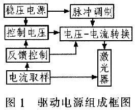 LD是依靠载流子直接注入而工作的,注入电流的稳定性对激光器的输出有直接、明显的影响,因此,LD驱动电源需要为LD提供一个纹波小,毛刺少的稳恒电流。该LD驱动电源包括4部分:基准电压源,恒流源电路,脉冲控制电路,?;さ缏贰=峁箍蛲既缤?所示。