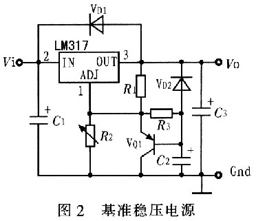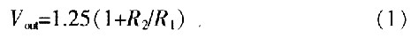 LM317是美国国家半导体公司的三端可调正稳压器集成电路,输出电压范围是1.2~37 V,负载电流最大为1.5 A,使用简单。其工作过程如下:输出电压Vout通过R1、VQ1,对C2充电,开始时VQ1饱和导通,Vout最低(约1.5 V)。随着C2上电压的升高,VQ1逐渐退出饱和并趋于截止,Vout逐渐升高至额定电压。改变R1、C2的常数可改变软启动的时间。改变可变电阻R2的值,可调整输出电压Vout的值。VD1用于关机后使C2上的电荷快速泄放。其输出电压为: