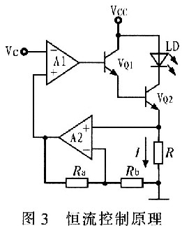 为了实现高的电流稳定度,驱动电路大多采用负反馈的控制方法,恒流控制原理如图3所示。稳流电路由基准电压电路、电压-电流转换电路、恒流输出电路和反馈电路组成。电路工作时,基准电压经过适当放大后送入运放A1的同相端,运放A1控制VQ1基极电流的大小,从而获得相应的输出电流,输出电流在取样电阻R上产生取样电压,该取样电压经A2放大后作为反馈电压反馈回电压放大器A1的反相输入端,并与同相输入端的电压进行比较,对输出电压进行调整,进而对VQ1基极的输出电流进行调整,使整个闭环反馈系统处于动态的平衡中,以达到稳定输出电流的目的。