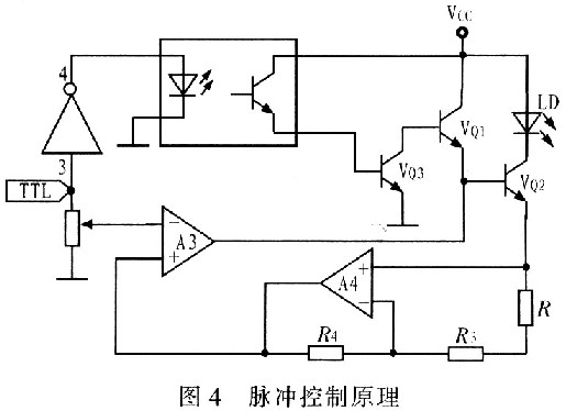 根据上述设计思想设计脉冲控制接口电路,其原理图如图4所示。由非门单元,晶体管VQ3,光电耦合器组成。当脉冲为高电平时,非门输出低电压,使光电耦合器截止,光电耦合器输出低电平,使晶体管VQ3截止,VQ3集电极输出高电平使VQ1、VQ2导通,LD正常工作;反之,光电耦合器导通,使VQ3导通,VQ3集电极输出低电平,使VQl、VQ2截止,LD不工作。在没有外控脉冲控制信号时,接口悬空,非门输入高电平,输出低电压,光电耦合器不工作,晶体管VQ3截止,VQ3集电极为高电平,使VQ1导通,保证LD的正常连续发光。