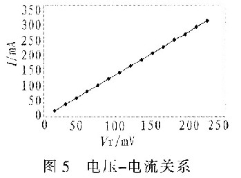表1是该电路驱动波长650 nm,功率200 mW的LD连续工作时,基准电压与输出电流的测试结果,其电压-电流关系如图5所示。