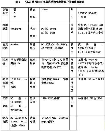 电容式接近开关属于一种具有开关量输出的位置传感器,它的测量头通常构成电容器的一个极板,而另一个极板是物体的本身,当物体移向接近开关时,物体和接近开关的介电常数ε发生变化,使得和测量头相连的电路状态也随之发生变化,由此便可控制开关的接通和关断。被这种接近开关的检测物体,并不限于金属导体,也可以是绝缘的液体或粉状物体,在检测较低介电常数ε的物体时,可以顺时针调节多圈电位器(位于开关后部)来增加感应灵敏度,一般调节电位器使电容式的接近开关在0.7-0.8Sn(Sn为电容式接近开关的标准检测距离)的位置动作。这里选用的是浙江省洞头县光电开关厂生产的CLG型M18×70标准结构的开关。它的外型图与尺寸标示图分别如图1与图2所示。