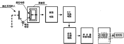 系统组成框图如图3所示,从框图可以看出控制信号的流程:当人或其它物体接近电容式接近开关时,等效电容的容量值会发生变化,从而改变LC振荡器的振荡频率,F/V电路将LC振荡器输出的频率量转化成电压量后,交给信号处理电路,该部分将电压信号进行一系列的处理(包括:放大、整形等)后传给开关量变换电路,开关量转换电路实际上是A/D转换器,它将模拟电压转换为数字量,水龙头控制电路由开关量转换电路的输出量控制,它产生控制信号控制水龙头的开与关。本系统设计成当人接近水龙头一定距离时,水龙头自动开启,离开一定距离后水龙头自动关闭。