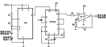 连线图如图4所示,由555定时器组成的振荡器,它的振荡频率为:f=1/0.69*(R1+2*R2)*(C//CT),C就是电容式接近开关的等效电容值,CT为频率调节电容,通过C的变化从而使振荡频率变化,将此种变化传给F/V电路,引起F/V电路的输出电压变化。由锁相环CD4046组成的F/V变换电路将频率值变成电压值后,经精密运放OP-07线性放大后输入到开关量转换器(A/D转换器)的输入端。