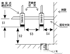 安装要求示意图如图5所示,图中S1表示检测面与支架的间距,要求≥1Sn,S2表示检测面与背景的间距,要求≥3Sn,S3表示并列安装间距,要求≥5Sn,S4表示检测面与侧壁的间距,要求≥3Sn。(Sn为电容式接近开关的标准检测距离)