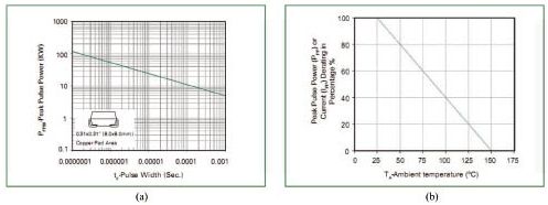 对瞬变电压的吸收功率(峰值)与瞬变电压脉冲宽度间的关系。手册给的只是特定脉宽下的吸收功率(峰值),而实际线路中的脉冲宽度则变化莫测,事前要有估计。对宽脉冲应降额使用。