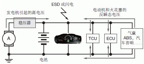 电子控制单元、传感器和信息娱乐系统等汽车电子设备连接在一根电源线上,如图7所示。这些电子产品的电源是电池和交流发电机,这两种电源的输出电压都不稳定,容易受温度、工作状态和其他条件影响。此外,使用燃油喷射系统、阀、电机、电气和水解控制器等电磁线圈负载的汽车系统,会把ESD、尖峰噪声和其他类型的瞬态和浪涌电压引入到电源和信号线上。因此,汽车设计中必须保护电子设备(例如控制单元、传感器和信息娱乐系统)免受电源线上出现的有害浪涌电压、瞬态电压、ESD和噪声的损害。瞬态电压抑制器(TVS)是汽车电子?;さ睦硐敕桨福旅嬷饕樯?a href="http://m.5r3h.cn/art/artinfo/id/80015045">TVS在汽车电源线中的初级?;ず痛渭侗;びτ?/a>。