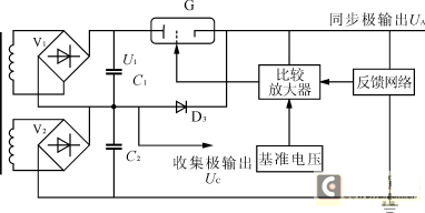 输入400Hz/220V电源,经高压变压器升压变换后,输出两路交流高压分别送入两组整流器及滤波器,其中一组作为收集极电压(Uc=15~18kV,Ic=85mA,而不需要专门做收集极高压,这是该电路的独特之处)送入行波管收集极。另外,将整流滤波后的两组直流电压串联,经调整管G稳压后输出稳定度很高的直流电压(UA=20~25kV,Ia≥15mA,稳压可调)给行波管的同步极。在调整管G的阴极和两整流器串联点之间接一个高压硅柱D3,对调整管G构成过压?;さ缏罚髡蹽出现的最高电压就是整流器V1空载时的输出电压。所以调整管G可以选耐压很低的管子。同时滤波电容C1、C2的耐压也相应降低了,因而大大减小了体积和重量。特别是消除了两组电压因充放电不一致引起高压差而打火。