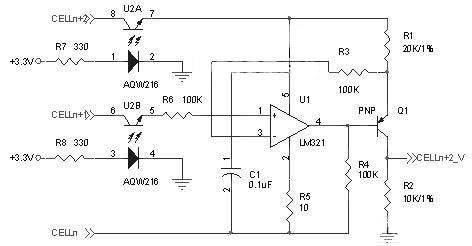 串联电池组电压测量的方法有很多,目前应用较多的是差分检测型与电流源检测型两种。差分检测型需要2个电阻对的阻值严格匹配,否则将影响电池组电压的检测精度,该方法使用中为了减少检测线漏电流对电池组一致性的影响,需要增加电阻的阻值,这样将增加了大规模生产的难度并降低了检测精度。而电流检测型的检测电路中仅需要一个电阻对的阻值匹配,为了提高检测的精度,需要小阻值的电阻匹配,但增大了检测线漏电流。在实际使用过程中为了减小检测线漏电流对电池组一致性的影响,以及减少电压检测电路的功耗,需要在电压检测线路上增加开关控制器件,往往采用光耦或者光电继电器。