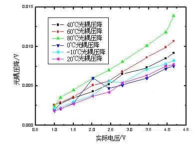 (1)光电继电器的误差。光电继电器的特性,受温度和导通内阻的影响都较多,为了验证光电继电器导致的测量误差,在不同温度调节下对光电继电器和电压检测电路进行了实验,在光电继电器上压降如图3所示,可以看出测试电压越高,光电继电器上的压降越大,最大差异约6mV左右,而温度越高,压降也越大,最大差异约7mV左右。